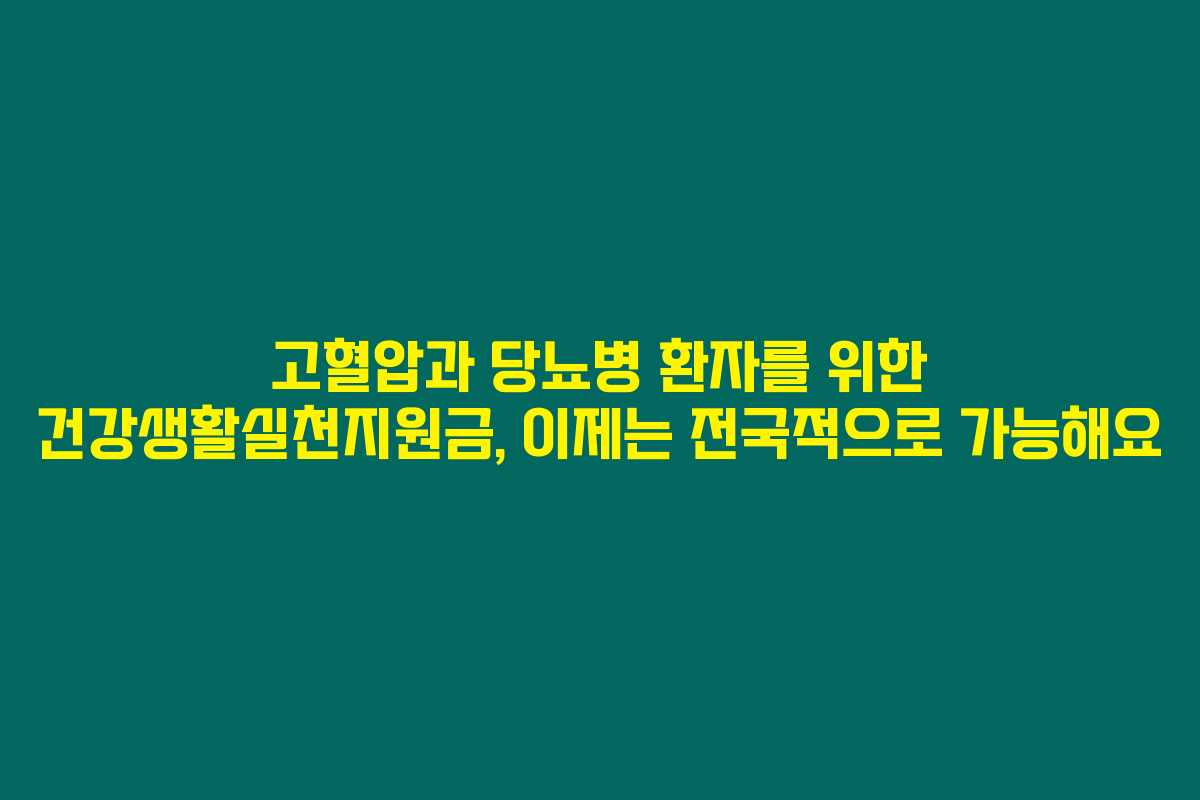 제가 직접 체크해본 바로는, 고혈압 및 당뇨병 환자들에게 제공되는 건강생활실천지원금이 이제 전국 109개 지역에서 확대되었습니다. 이는 기존의 10개 지역에서만 지원되었던 것에 비해 많은 환자들에게 더 큰 도움이 될 것으로 예상됩니다. 아래를 읽어보시면, 이 지원금이 어떻게 작동하며 어떤 혜택을 받을 수 있는지에 대한 자세한 정보가 포함되어 있어요.