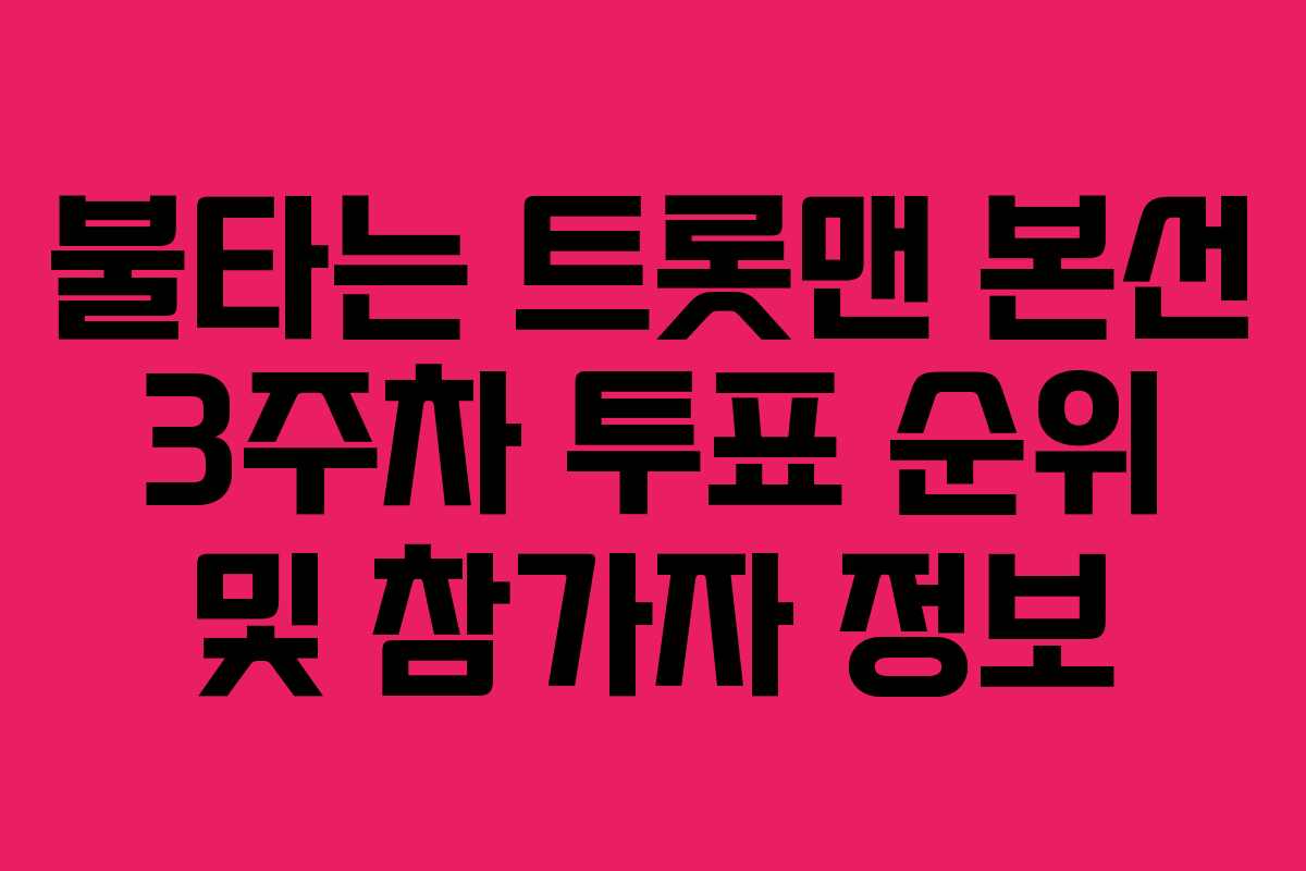 불타는 트롯맨의 본선 3주차 투표 결과가 발표되었습니다. 이번 방송에서는 황영웅과 남승민, 에녹이 TOP3에 오르며 팬들의 큰 관심을 받고 있습니다. 본선 참가자들 중 누가 최종 우승자가 될지에 대한 기대감이 높아지고 있습니다.