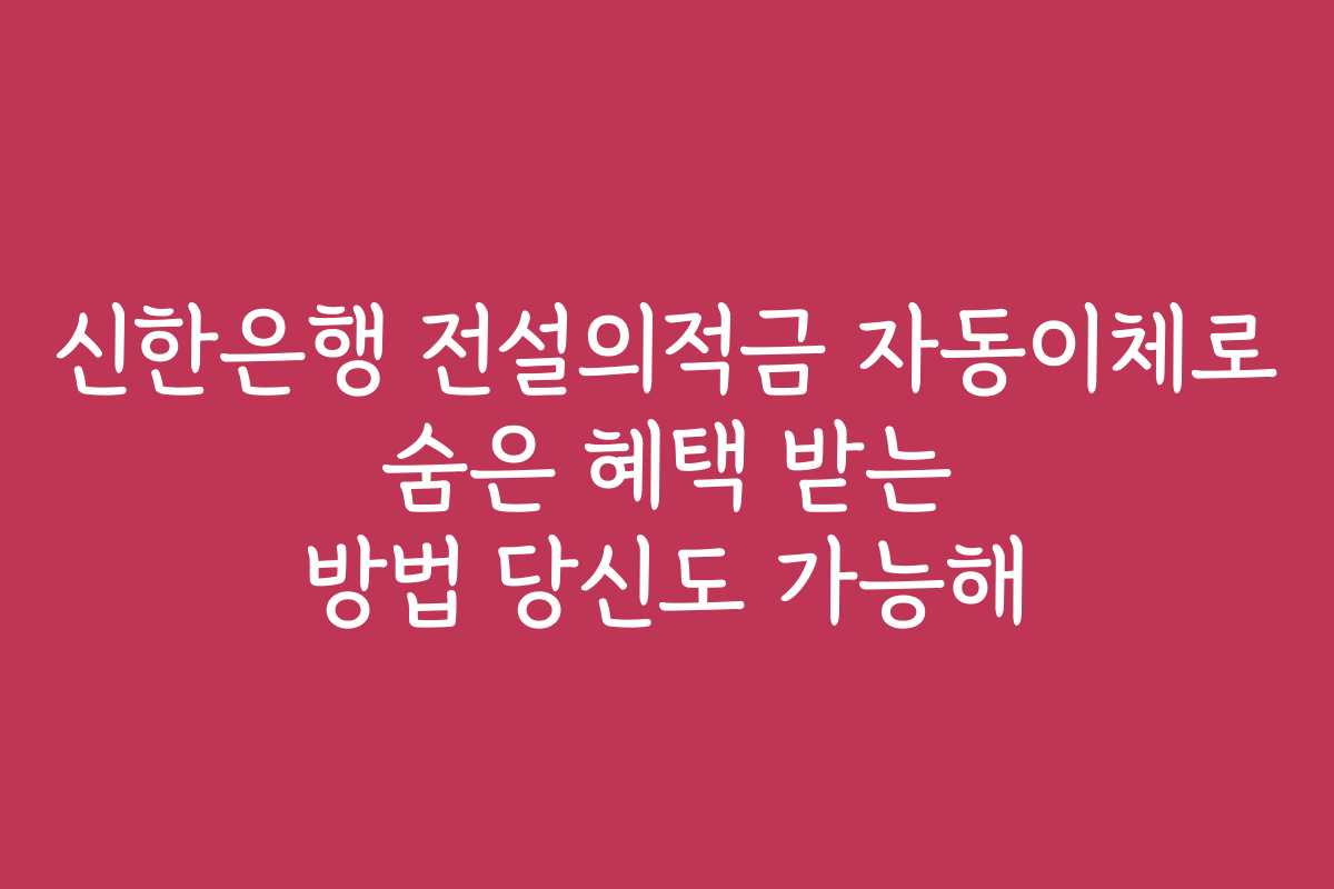 신한은행 전설의적금으로 미래를 준비하고 싶으신가요? 많은 분들이 적금 혜택을 놓치고 있습니다. 이 글에서 신한은행 전설의적금 자동이체로 숨은 혜택을 받는 방법을 알아보겠습니다.