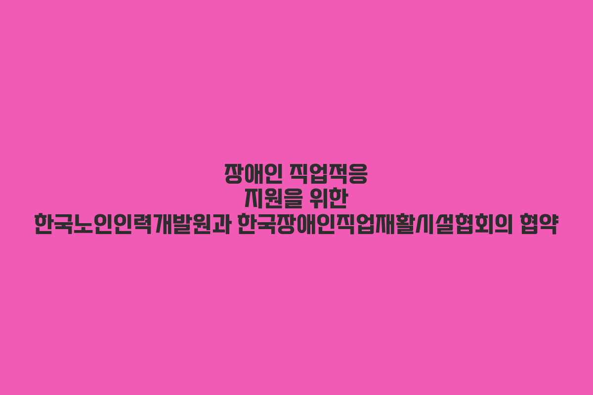 한국노인인력개발원과 한국장애인직업재활시설협회가 장애인 직업적응 지원을 위해 협약을 체결했습니다. 이번 협약은 노인일자리를 활용하여 장애인 직업훈련을 지원하는 내용을 담고 있습니다.