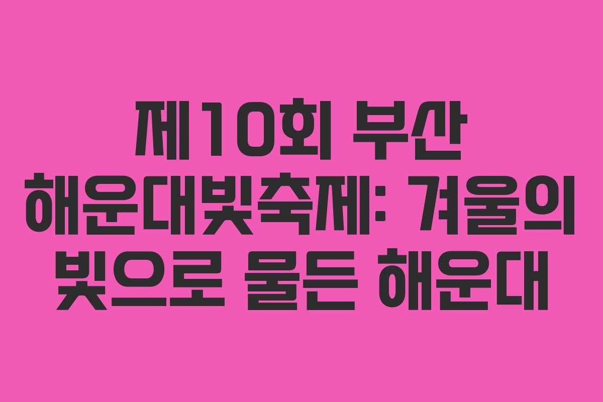 부산 해운대에서 열리는 제10회 해운대빛축제가 2023년 12월 2일부터 2024년 1월 31일까지 개최됩니다. 이 축제는 해운대 해수욕장 일대에서 아름다운 빛의 향연을 선보이며, 방문객들에게 특별한 경험을 제공합니다.