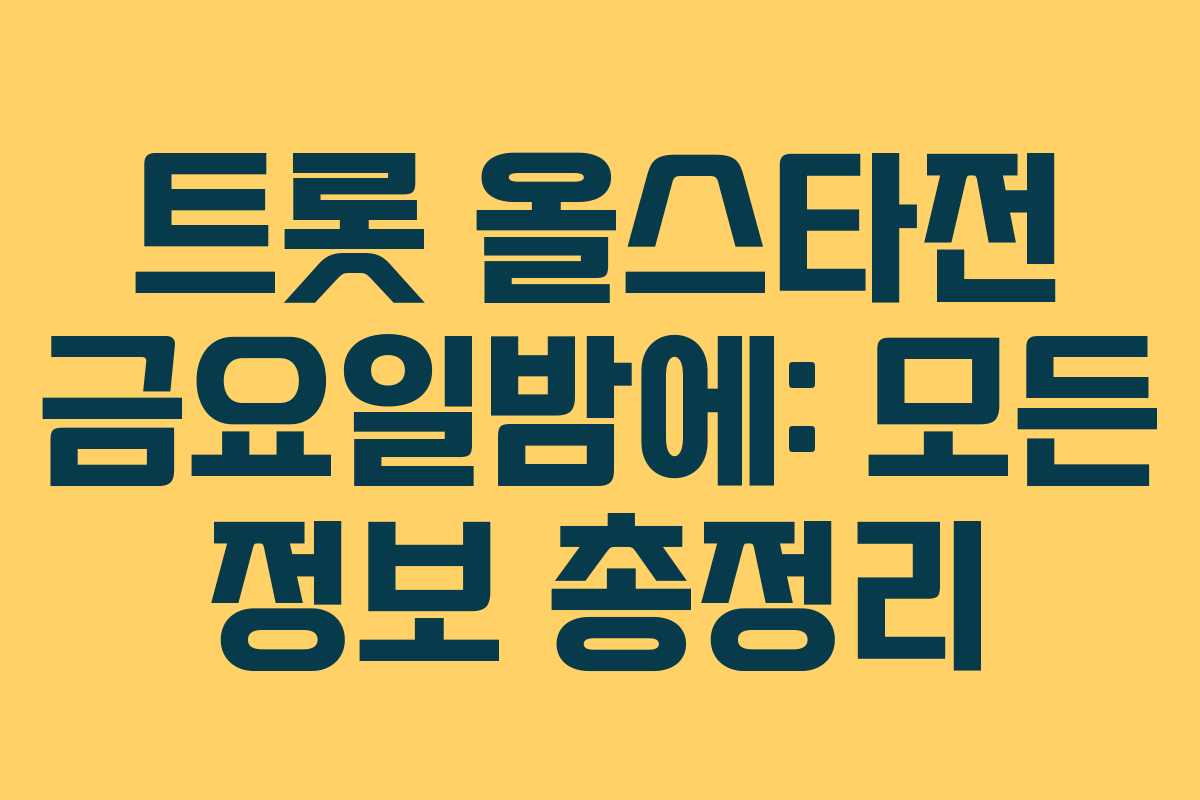 트롯 팬이라면 주목해야 할 프로그램, 《트롯 올스타전 금요일밤에》에 대한 모든 정보를 정리해 드립니다. 방송 시간, 출연진, 시청률, 방청 신청 방법 등 다양한 요소를 살펴보겠습니다.